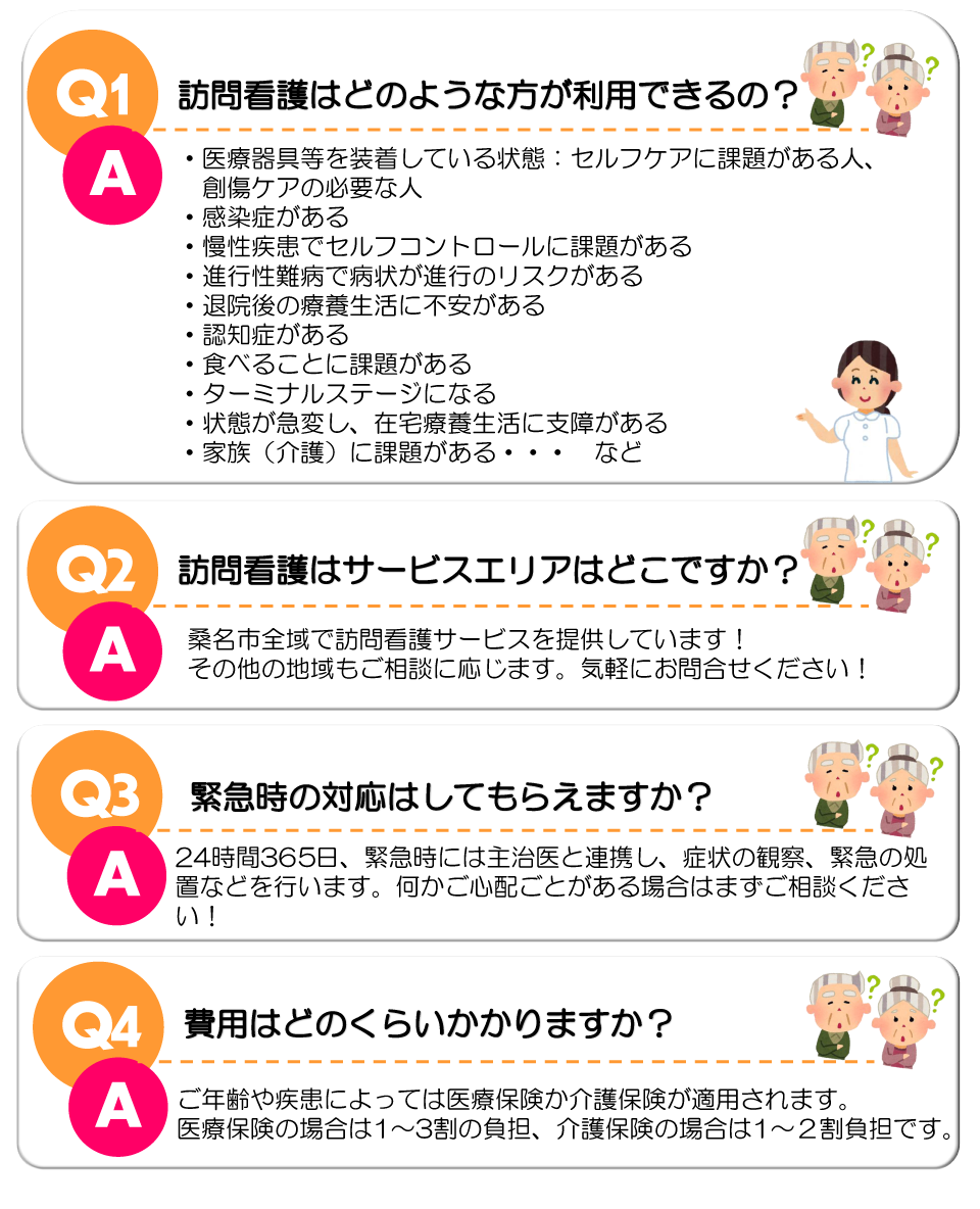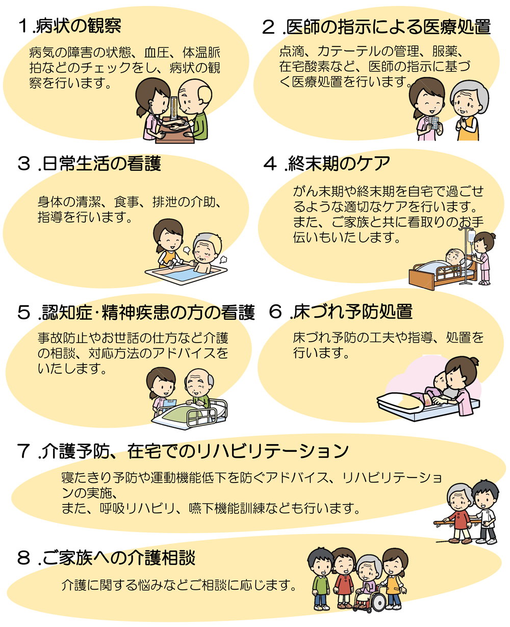 健康状態の悪化防止や、回復に向けてお手伝いします。主治医の指示を受け、病院と同じような医療処置も行います。